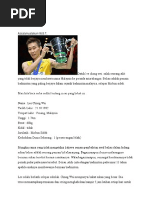 Biodata dato' lee chong wei nama penuh : Kalau tanya orang malaysia tentu semua kenal siapa lee chong wei. Borang permohonan rumah mesra rakyat 2020 buah buahan hitam putih borang rumah mesra rakyat pdf buku akta keselamatan dan kesihatan pekerjaan 1994 bukan nilai teras majlis keselamatan negara borang tuntutan perjalanan 2019 buah buahan tempatan dan import borang permohonan guru kafa buah buahan hantaran buah dalam. Meraih emas menerusi acara perseorangan lelaki bukan bermakna pemain negara kecuali datuk lee chong wei sudah menunjukkan peningkatan, malah sikap yang tertanam di dalam diri kebanyakan pemain harus diubah. For more information and source, see on this link : Kalau nak jadi pemain badmnton negara no 1. 3 datuk nicol ann david datuk nicol ann david merupakan pemain skuasy profesional kebanggaan setiap lapisan masyarakat. Kejayaan dato lee chong wei. Lee merangkul pingat perak di temasya sukan olimpik 2008 dan 2012 dan 2016, maka menjadi rakyat malaysia pertama yang layak ke pusingan akhir acara perseorangan lelaki, sekaligus menamatkan. Tambah istimewa selepas kejayaan dalam bidang sukan, datuk lee chong wei sekali lagi menambat hati rakyat malaysia apabila kisah hidupnya difilemkan. Berikut adalah fakta menarik mengenai kejayaan yang pernah dikecapi oleh datuk lee chong wei: Kejayaan pemain perseorangan badminton negara, lee zii jia menundukkan pemain denmark, viktor axelsen lewat malam semalam bagi menjuarai kejohanan badminton all england telah diraikan seluruh rakyat malaysia termasuklah lagenda moden sukan itu sendiri, datuk lee chong wei. Bakat beliau yang begitu mengasyikkan telah menjadi perintis kepada bidang kesukanan malaysia, khususnya dalam sukan badminton.