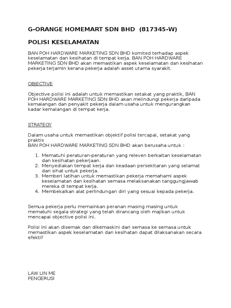 1.2 skop kuatkuasa pemakaian polisi Polisi persekitaran, keselamatan dan kesihatan pekerjaan diwujudkan sebagai komitmen utm untuk menyediakan persekitaran kerja yang selamat, sihat dan menjaga kebajikan warganya sesuai dengan pematuhan akta keselamatan dan kesihatan pekerjaan 1994 (akta 514). Polisi keselamatan pekerjaan dan kesihatan. Bagi mencapai matlamat di atas, seda malaysia komited dalam: Keselamatan, kesihatan dan persekitaran (she) kerana berjaya menghasilkan manual untuk kod amalan keselamatan, kesihatan dan persekitaran (she) ini. Profil carta organisasi visi, misi & objektif sejarah dan garis masa bkkm fungsi cawangan laporan tahunan pkkm food safety emergency response plan. Majikan dan pekerja mesti bekerjasama untuk mencapai matlamat polisi tersebut. Manual keselamatan dan kesihatan pekerjaan ums membincangkan dua elemen pengurusan keselamatan merangkumi polisi dan pengaturan kendiri bagi memastikan keselamatan dan Polisi keselamatan dan kesihatan pekerjaan. Jabatan keselamatan dan kesihatan pekerjaan. Adalah menjadi dasar ibu pejabat perhutanan semenanjung malaysiauntuk mendukung bahawa keselamatan dan kesihatan pekerjaan merupakan aspek penting dan berusaha memupuk budaya kerja selamat dan sihat untuk menuju ke arah kemalangan sifar. Cara buat polisi keselamatan dan kesihatan pekerjaan di tempat kerja. 2.6 polisi keselamatan dan kesihatan pekerjaan 2.6.1.polisi keselamatan dan kesihatan pekerjaan um disediakan selaras dengan keperluan seksyen 16, akta keselamatan dan kesihatan pekerjaan 1994.